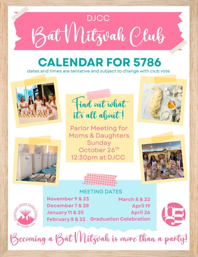Join us for a parlor meeting to hear what the Bat Mitzvah Club is all about Sunday, October 26 12:30-1:30 pm At Downtown Jewish Center Chabad The whole family is welcome Refreshments will be served Please reserve via text or WhatsApp to BMC leaders Chana at 954.913.6184 or e-mail [email protected] Please share the event with your friends of Bat Mitzvah age, girls ages 11-13, who may also be interested