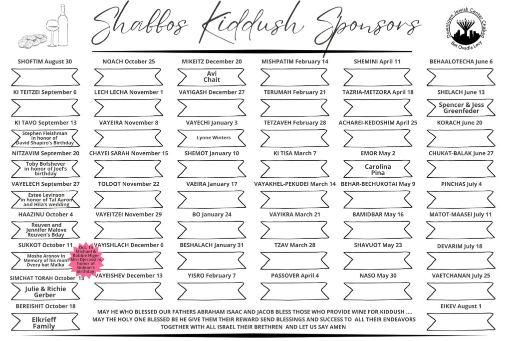 Consider sponsoring a Kiddush in honor or memory of a loved one and be part of this amazing Shabbat experience.